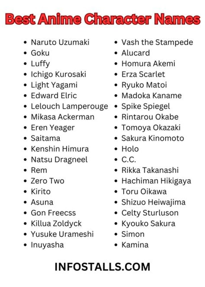 Iconic anime character names include "Goku" (Dragon Ball Z), "Naruto" (Naruto), and "Pikachu" (Pokmon). These names have become synonymous with the characters they represent and have transcended the boundaries of anime to become globally recognized symbols.