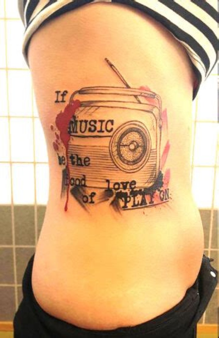 Popular music tattoo designs include song lyrics, band logos, portraits of musicians, musical instruments, and abstract representations of musical concepts.